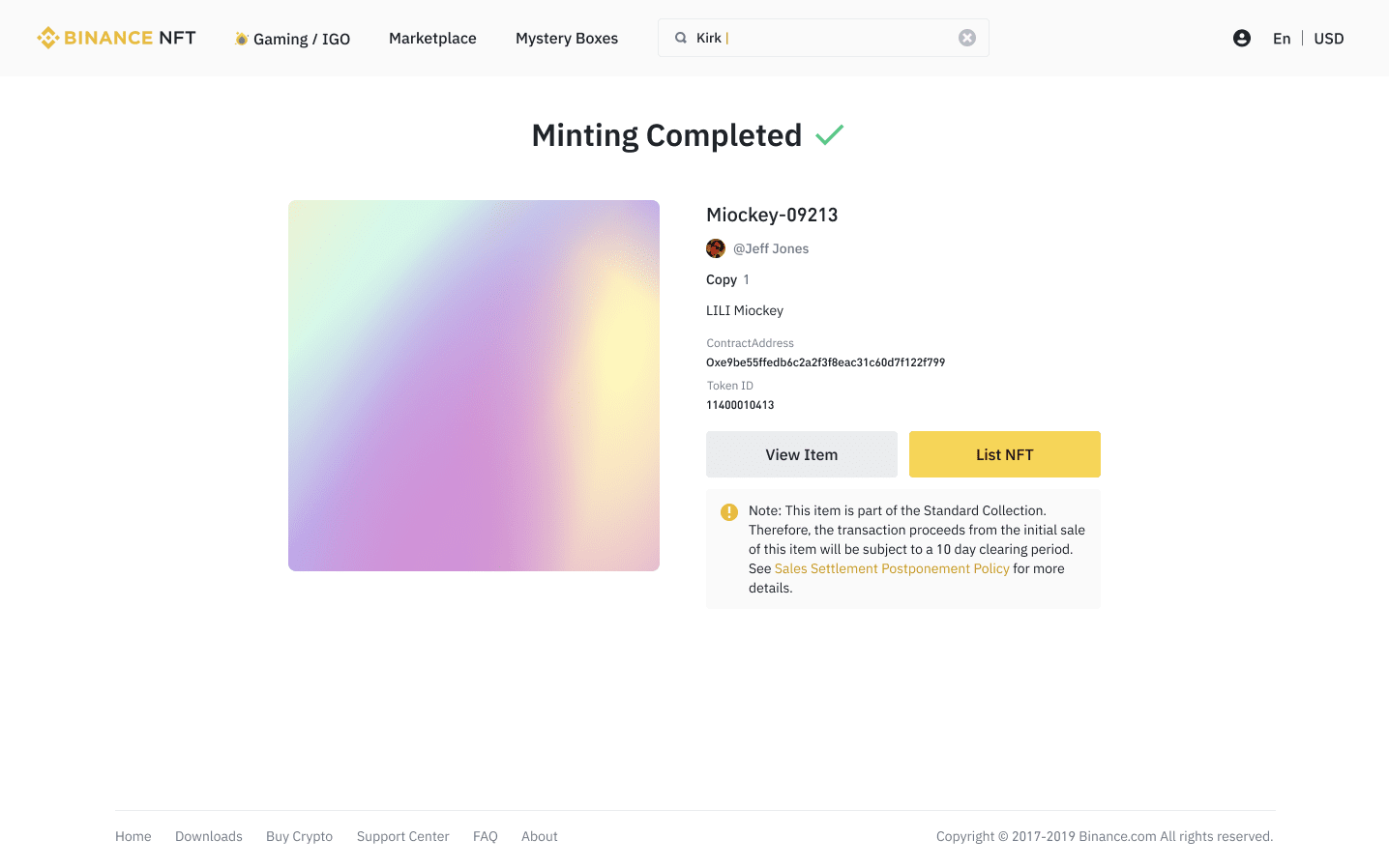Sau khi NFT tiêu chuẩn đáp ứng khoảng thời gian chờ thanh toán 10 ngày, nếu (các) tài sản đã bán không cho thấy có khả năng vi phạm Quy tắc và Điều khoản dịch vụ của Binance NFT, bạn sẽ có thể sử dụng hoặc rút khoản tiền thu được. Thời hạn này có thể được điều chỉnh trong tương lai.
